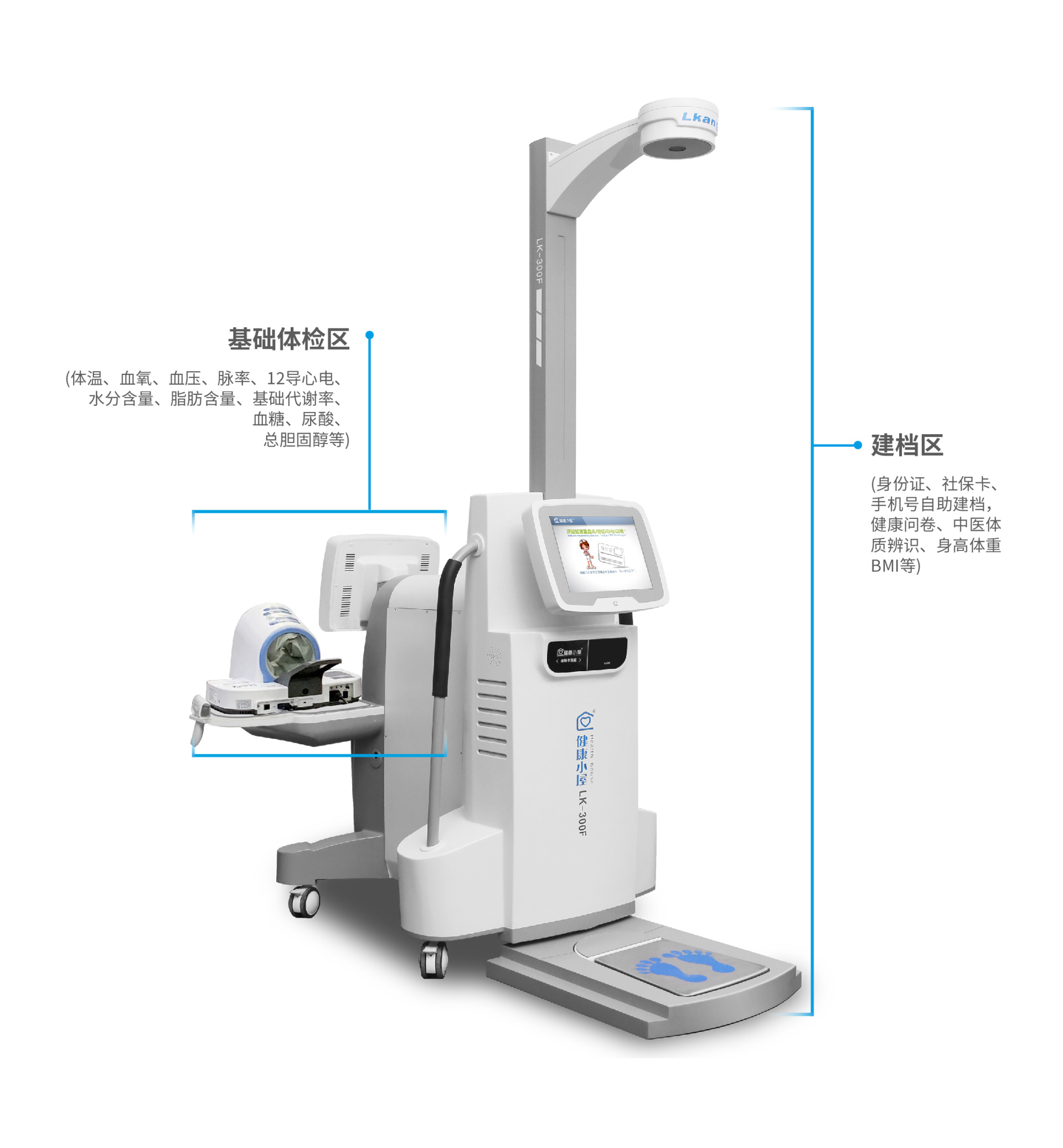 產(chǎn)品特點:外觀時尚、醫(yī)療設(shè)備感強;支持雙人在線使用;即時打印體檢報告及健康促進(jìn)建議;